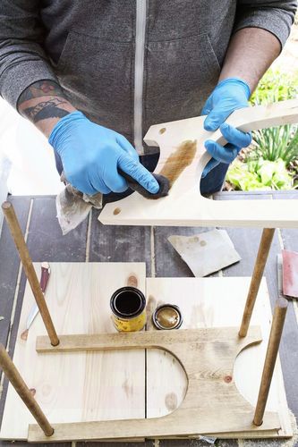 Зачистите детали шлифовальной шкуркой или наждачкой, а после покройте их морилкой или пропиткой для древесины и дайте высохнуть. После полного высыхания первого слоя нанесите еще один, а при желании - два. Все зависит от того, насколько интенсивную окраску вы хотите получить.