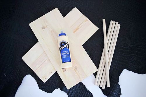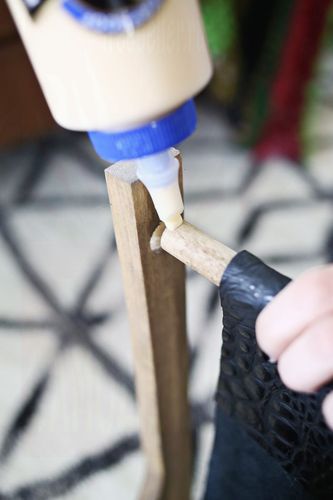 Проденьте деревянные палочки в «уши» кожаного кармана, но прежде, чем вставить их в отверстия, нанесите немного столярного клея, чтобы конструкция хорошо держалась. Излишки клея уберите влажной тряпкой и позвольте клею высохнуть.