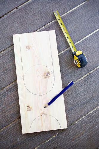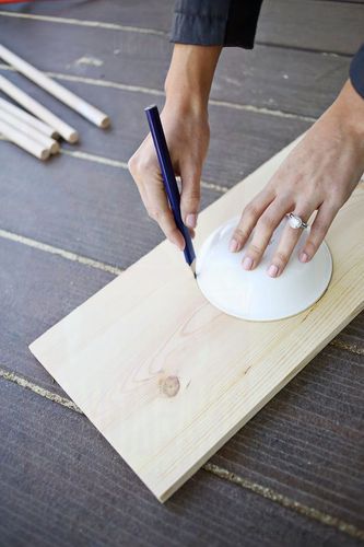 Для начала нужно нарисовать простым карандашом детали боковых частей на дереве. Снизу обведите половину чаши, чтобы получить полукруг, сверху-обведите чашу полностью, расстояние между ними должно равняться 10 см. От круга проведите две прямые параллельные линии, как показано на фото.