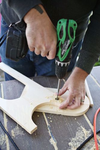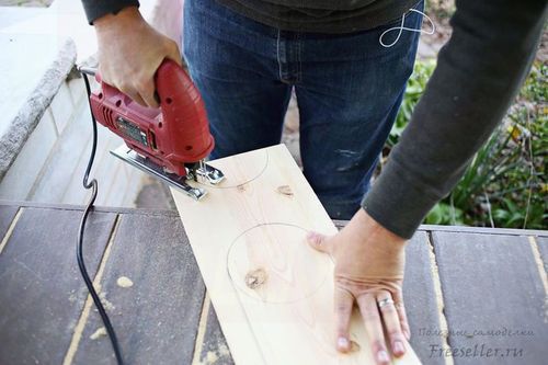 С помощью лобзика вырежьте из дерева нарисованные фигуры. Если вы пользуетесь электрическим лобзиком (это очень удобно, увлекательно и совсем не сложно!), то самое главное - закрепить деревяшку, чтобы она не двигалась.