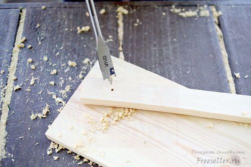 Теперь нам необходимо сделать отверстия. Используя карандаш, сделайте отметки на деревянной заготовке. Просверлите отверстия в намеченных местах. Их диаметр должен соответствовать диаметру заготовленных деревянных палочек.