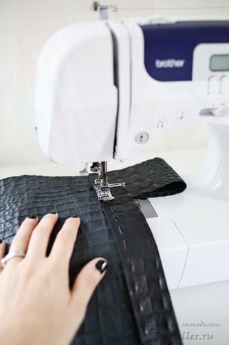 Сшейте кожу на швейной машине. Для того, чтобы кожа в два слоя не разъезжалась и швы вышли ровными, можно на внутреннюю сторону нанести текстильный клей и сложить части.