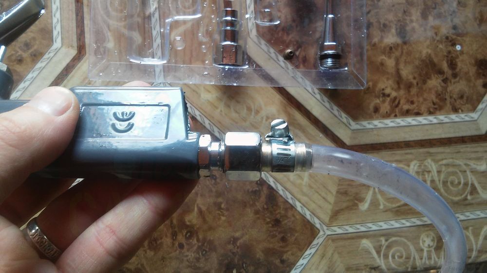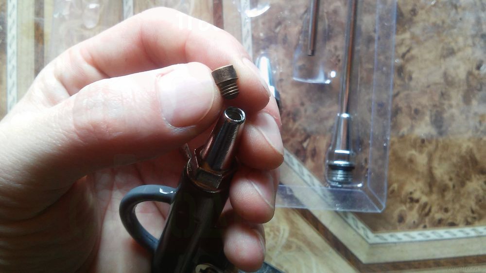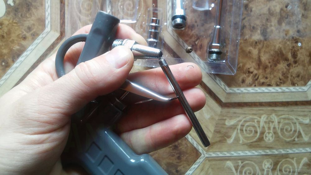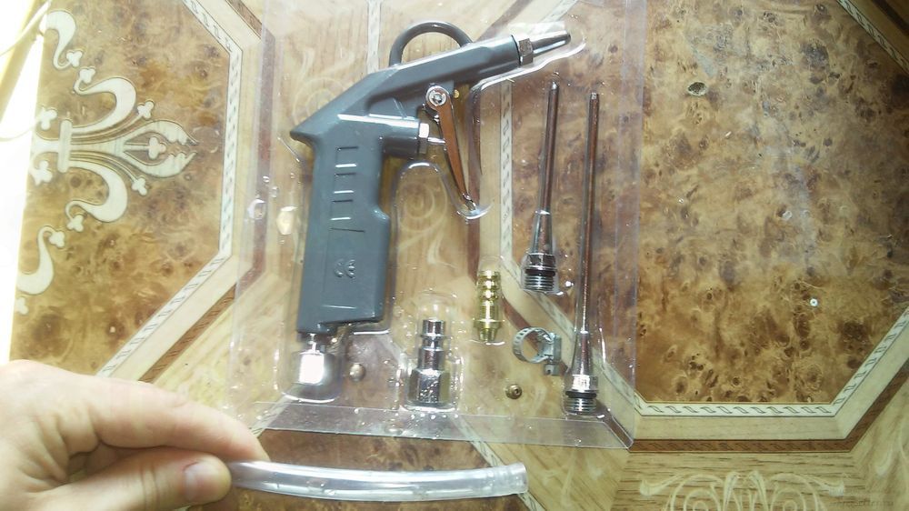 Сперва подключаем шланги к насосу и модернизируем продувочный пистолет, предварительно вкрутив в насадку распылителя жиклер от карбюратора, за счет которого будет создаваться повышенное давление, так как отверстие в жиклере очень маленькое.