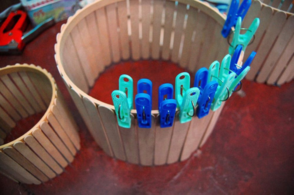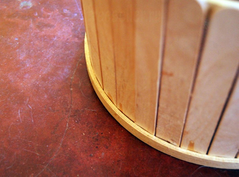 С наружной стороны оклеиваем обручи деревянными палочками от мороженого. Горячий клей быстро схватывается, но будьте осторожны, не обожгите пальцы. Обратите внимание, что приклеивать палочки надо к наружной стороне внутренних обручей! Если палочки различаются по размерам, то для обручей с большим диаметрам лучше использовать крупные палочки, а мелкие оставить для самого мелкого обруча. Расстояние между палочками должно быть около 3 мм. Дайте конструкции хорошо высохнуть.