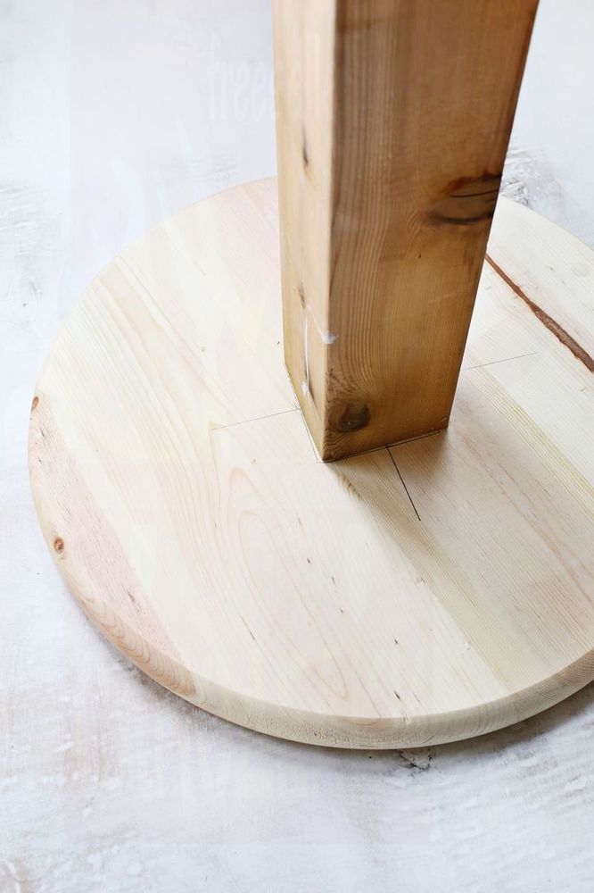 Первым делом необходимо установить столбик на круглый деревянный диск. Столбик должен стоять в самой середине диска. Обведите карандашом место, где стоит столбик, и прибейте его гвоздями с оборотной стороны диска. После установки покрасьте деревянный диск белой краской в несколько слоев. Дайте хорошо высохнуть.