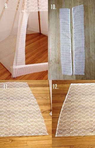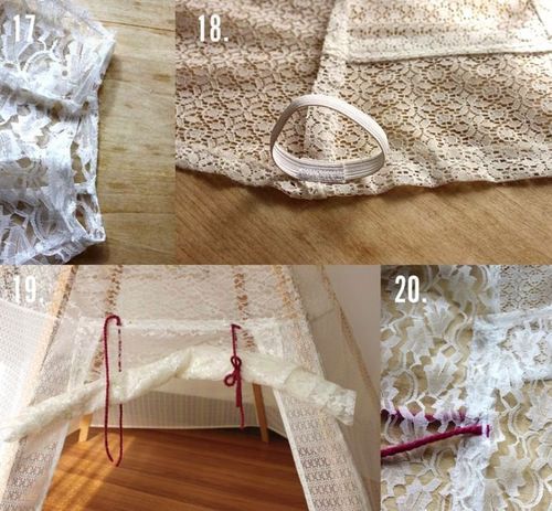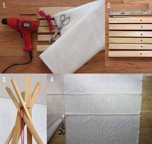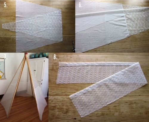 Измерьте столбики и от конца отмерьте 50 см примерно. Просверлите отверстия в каждом столбике и проденьте через них веревку, затяните их крепко. Установите деревянную основу вигвама на полу. Разложите ткань на полу и отмерьте необходимый кусок, чтобы он подходил под каждый угол. Второй кусок ткани тоже отмерьте и разделите его пополам, сшейте куски обоих видов ткани так, чтобы нижняя часть была из кружева с мелким рисунком, а верхняя с более крупным. Должно поучиться пять треугольников из ткани. Сшейте их вместе и обтяните ими конструкцию из столбиков.