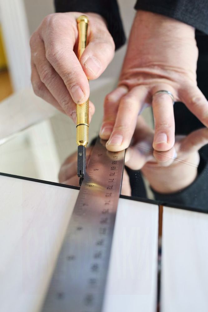 Затем зеркало необходимо сдвинуть к краю стола . Быстрым движением надавите на край заркала, оно лопнет ровно по отмеченной линии. Обращаться с отрезанным стеклом нужно аккуратно, чтобы не порезаться нечаянно.