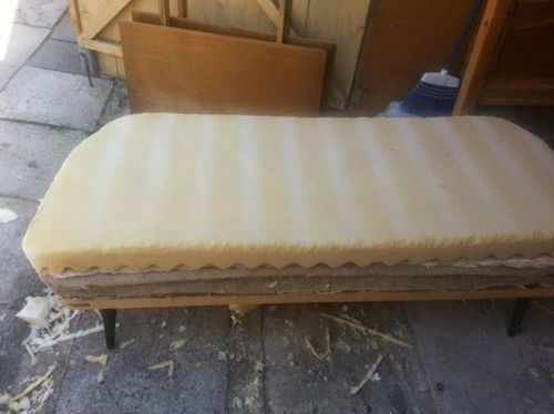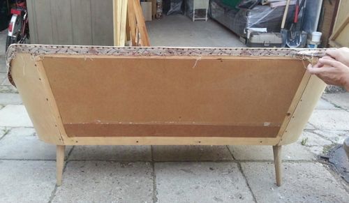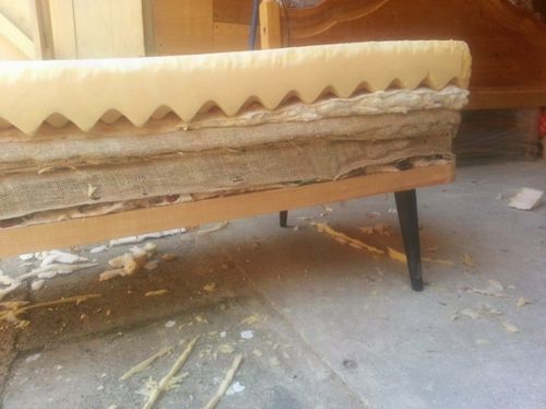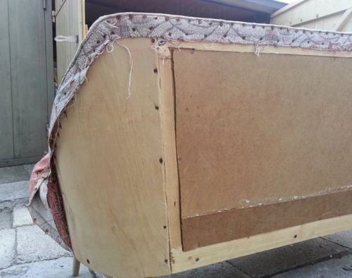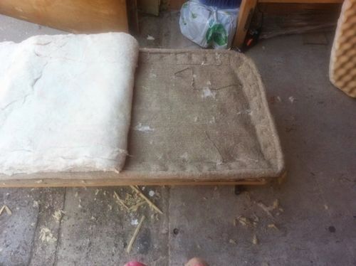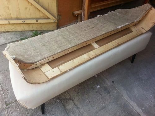 Теперь пришла пора избавиться от старой обивки. Если она закреплена мебельными скобами, то их нужно отогнуть, но так, чтобы не повредить каркас.