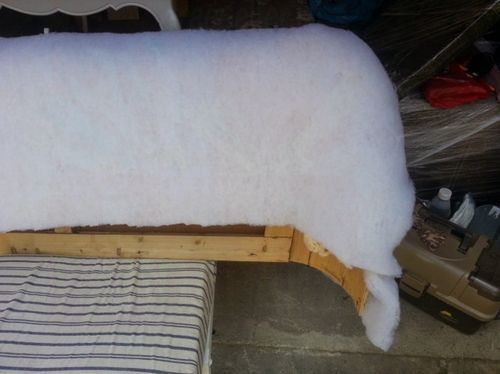Закончив с сиденьем, переходим к обновлению спинки. Тут все просто: снимаем старую обивку, для того, чтобы спинка стала более мягкой и пухлой, обтягиваем ее слоем синтепона, а затем надеваем новый чехол.