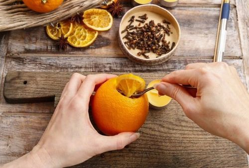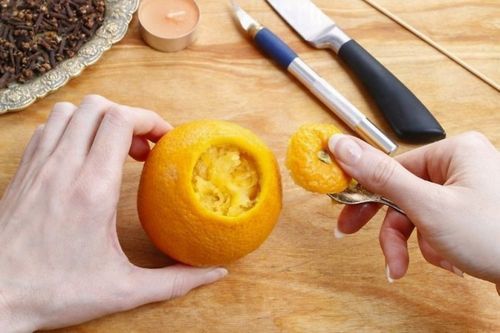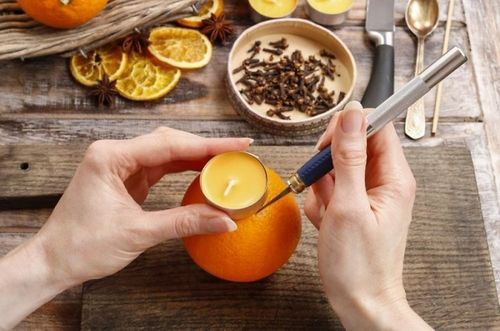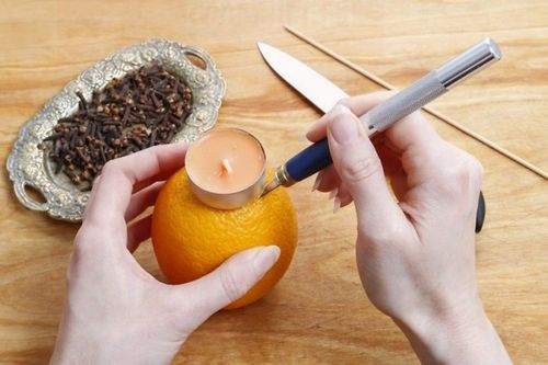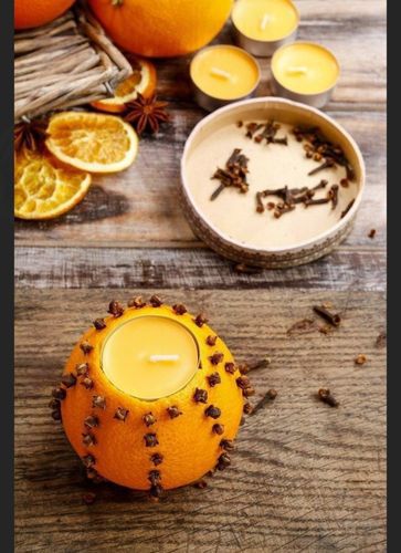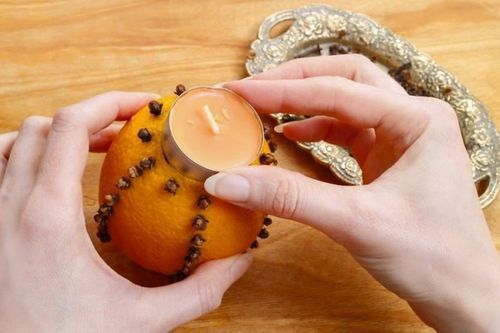 После того, как гвоздички займут свое место, можно вернуть на законное место свечку-«таблетку». Кстати, сама свеча так же может быть ароматизированной. Свечи с запахом цитрусовых даже окраску имеют под цвет фруктов.