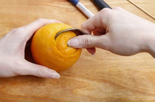 Чайной ложкой извлеките отрезанную часть апельсина, не нажимая на фрукт. Шляпка легко отделяется, если ваш нож, используемый для работы, достаточно острый. Иначе он завязнет в мякоти и работу придется начинать сначала. Подденьте чайной ложкой край «шляпки» и аккуратно ее отделите от апельсина.