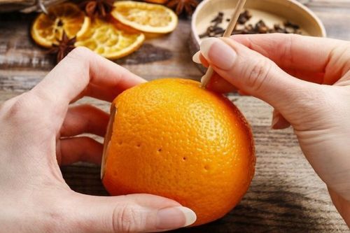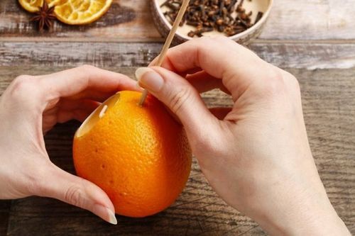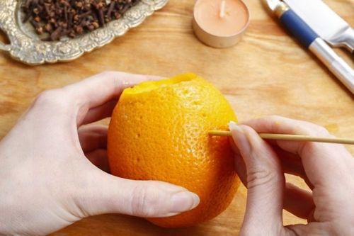 Острой палочкой сделайте в кожуре апельсина небольшие отверстия. В каком порядке их расположить - дело ваше. Можно последовать примеру на фото, сделать дорожки сверху вниз. А можно придумать причудливые узоры, «написать» слова и даже признаться в любви.
