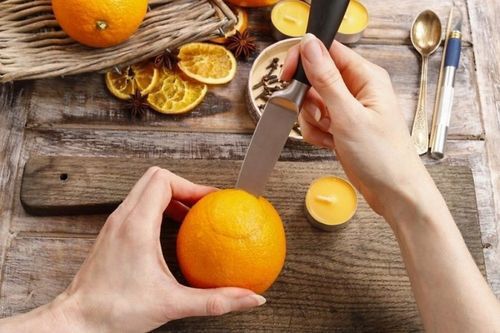 Возьмите апельсин, и острым ножом отрежьте сверху «шляпку». Старайтесь не повредить мякоть, чтобы избежать потоков сока, которые сделают «свечку» липкой и будут мешать вам работать дальше.