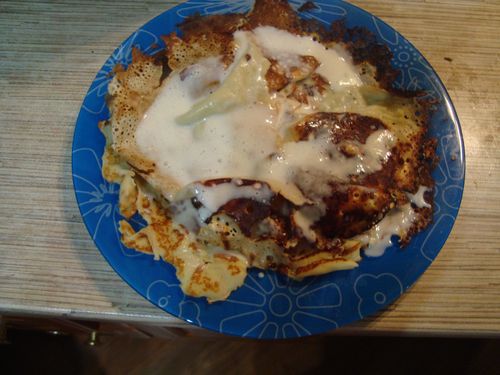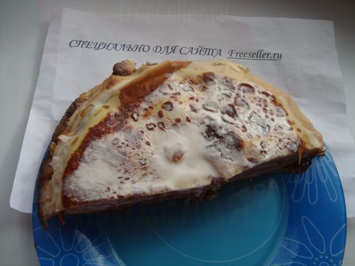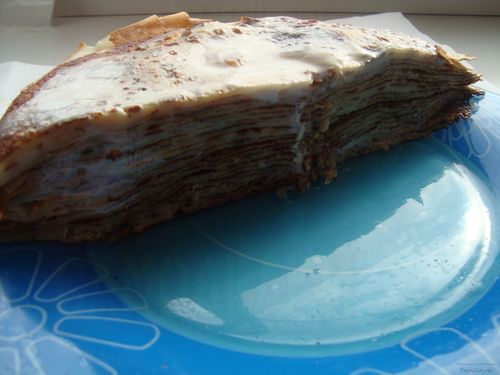Не беда, если некоторые блинчики не получились ровно. Просто сложите их в ровный слой и залейте кремом.