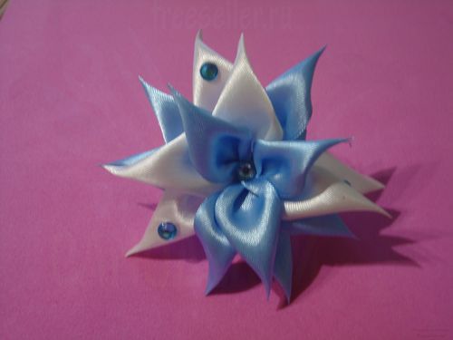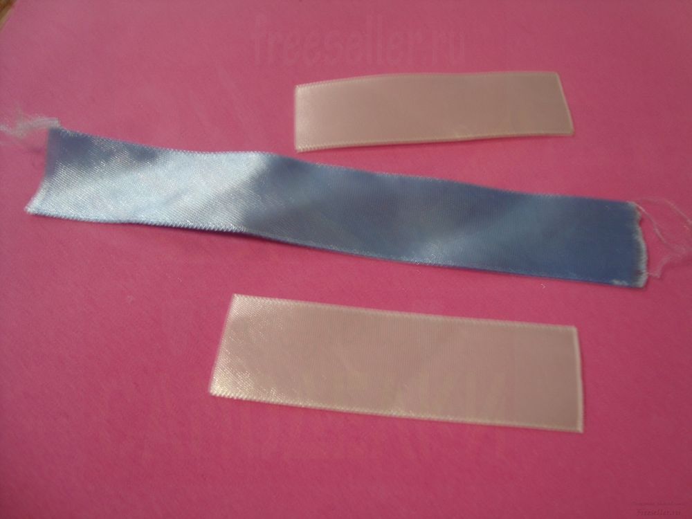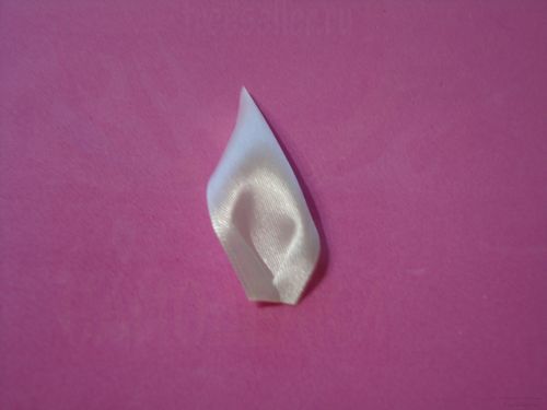 Сначала разрежь ленты на лоскуты размером по 5- 6 см. Каждый отрез сворачивается пополам вдоль, при этом гладкая сторона атласа ложится наружу. Верхний край ленты зажмите под углом в 45 градусов.