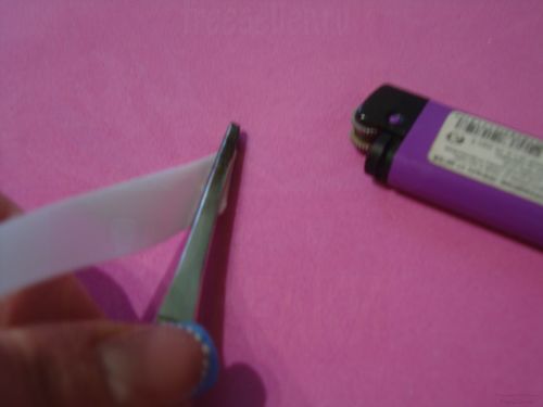 Срежьте лишнюю часть ленты острыми ножницами и опалите срез над пламенем свечи (или зажигалки). Обязательно края крепко держите пинцетом, чтобы слои атласа оплавились и склонялись между собой.