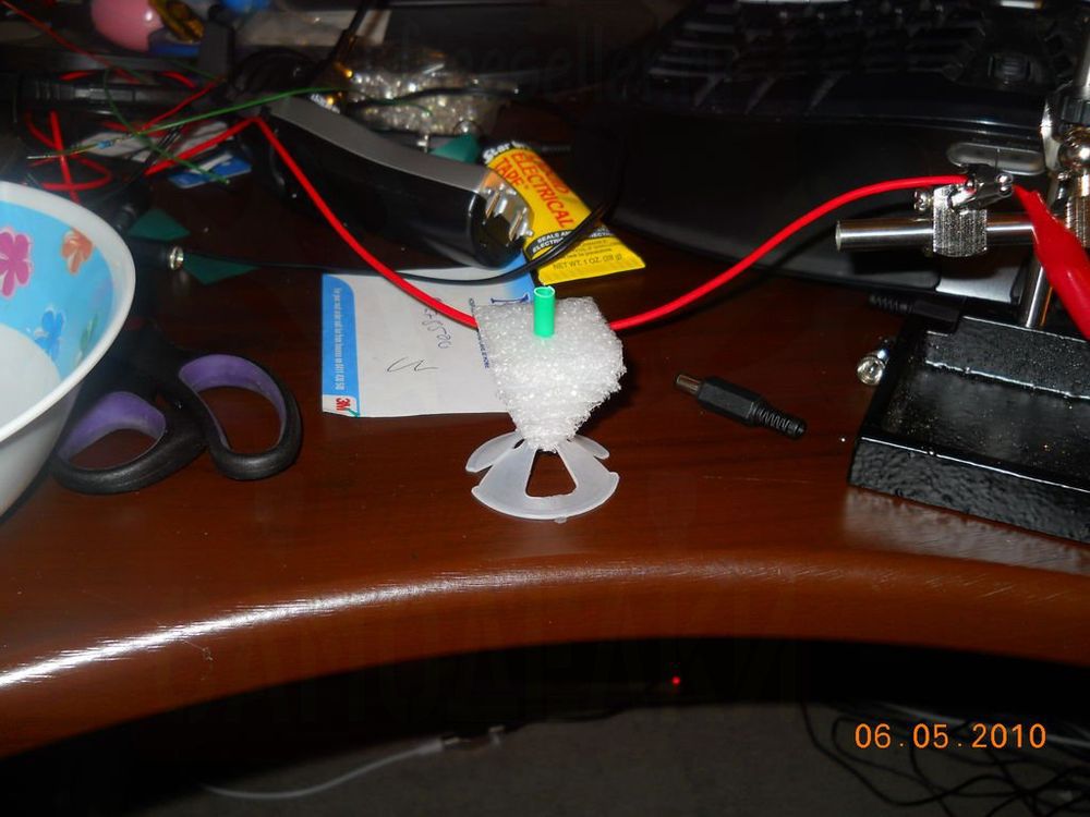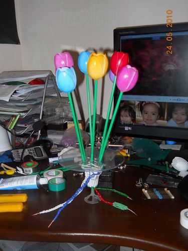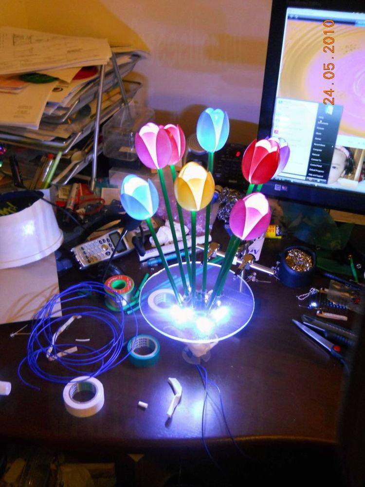 Ориентируясь на полученную икебану, нужно проделать отверстия для стеблей во вкладыше для горшка, который вырезается из прозрачного плексиглаза (по размеру, соответствующему диаметру будущего горшка). С помощью клея (или других подручных средств) стебли цветов крепятся на вкладыше из плексиглаза. Далее нужно провести пайку цепи светодиодов и проводов питания к ним.