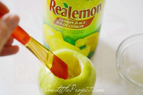 Каждый наверняка знает, что на воздухе нежная яблочная мякоть очень быстро чернеет - окисляется железо, которым яблоки так богаты. Для того, чтобы этого избежать и сохранить первоначальный цвет, мякоть нужно смазать лимонным соком. Тщательно смажьте кистью, обильно смоченной в лимонном соке, заготовленное отверстие для свечи, особое внимание, уделив краям.