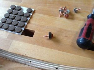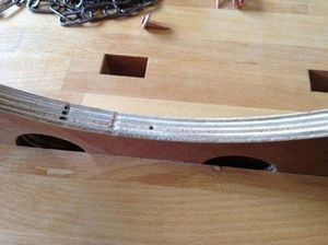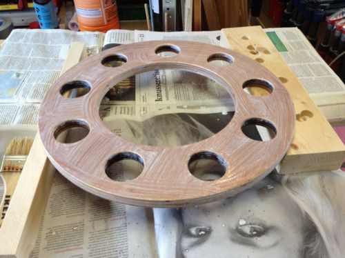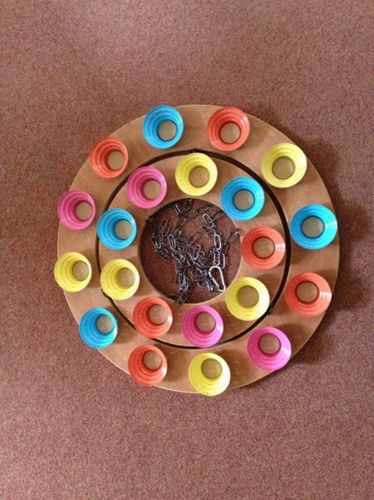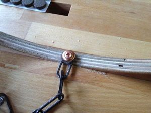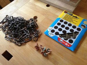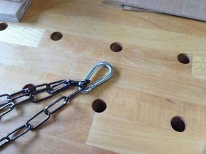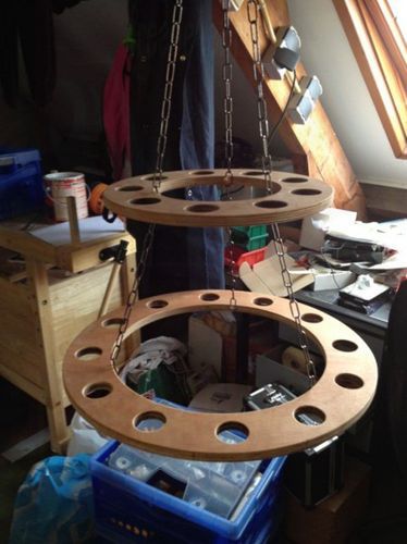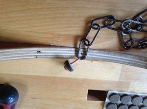 Цепь укреплять лучше всего крупными болтами с широкой шляпкой. Также обязательно сделать маленькие диски из войлока и вкрутить их в болты, перед тем как закреплять их. Через четыре кружка для подсвечников сделать отверстия во внешнем круге, во внутреннем через каждые три. Все три куска цепи соединяем карабином.