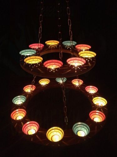 Очень красиво будет смотреться самодельная двухуровневая люстра, в которой вместо лампочек будут гореть свечи.