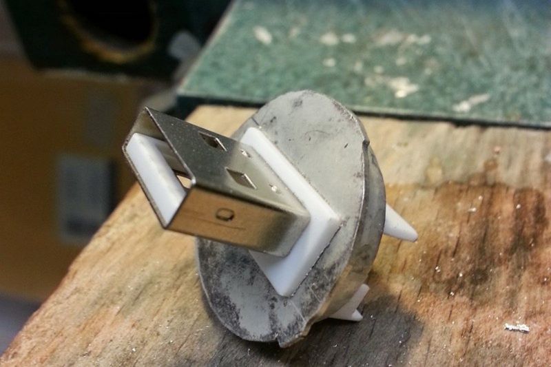 Нижняя часть футляра тоже задекорирована. Чтобы кусок из пластика не выпирал, можно вставить в торец стандартный USB-разъем. Он монтируется в пластину из стали круглой формы.