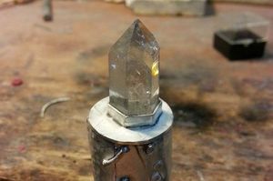 Можно оставить оригинальный светодиод, а можно заменить на лампочку покрупнее с припаянными проводами. Это делается для того, чтобы свет находился ближе к кристаллу. Чтобы спаять мелкие контакты потребуется увеличительное стекло и главный инструмент - паяльник с тонким жалом.