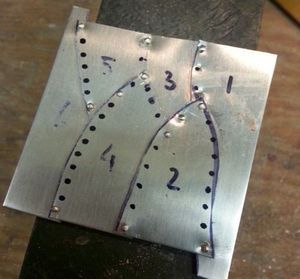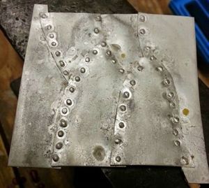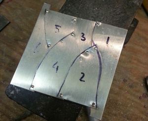 Сначала пластины соединяются по углам, а потом оставшиеся заклепки припаиваются вдоль всей кромки листов. Расстояние от каждой заклепки до другой - несколько миллиметров.