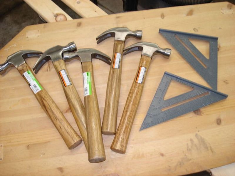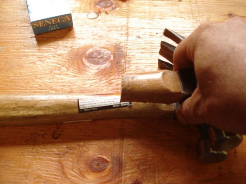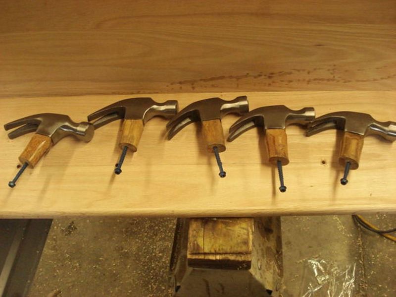 Крючками в вешалке будут выступать головки молотков (гвоздодеры смотрят вниз). Прежде, чем отрезать верхушки, нужная высота и угол отмеряются с помощью линейки. Первый крючок для вешалки - это образец.