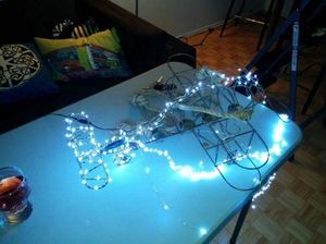 На винт вешается крючок с веревкой, на него - каркас люстры. С помощью клея кабель протягивается вдоль потолка и стен до розетки. Люстра готова к работе!![]()