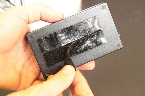 Аккумулятор будет располагаться снаружи. Чтобы закрепить его, понадобится липкая застежка. Мягкая ее сторона крепится на батарею и фиксируется на корзине. Батарея должна располагаться чуть ниже усилителя.