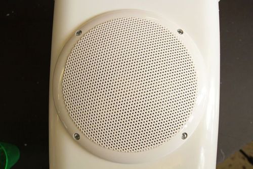 Динамик крепится к корзине с помощью болтов. Для начала спикер прикладывается к внешней поверхности и маркером отмечаются будущие отверстия для крепежа - четыре точки.