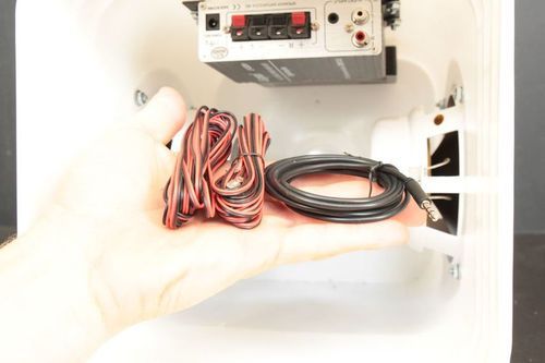 Провода, которые обычно имеются в комплекте со спикерами, можно приобрести и отдельно. Вся проводка располагается внутри. Спикеры подключаются к усилителю, провода удерживаются с помощью изоленты. Батарея подключается к усилителю.