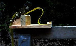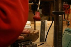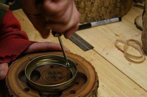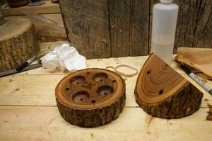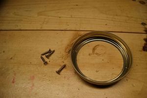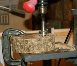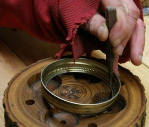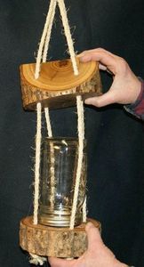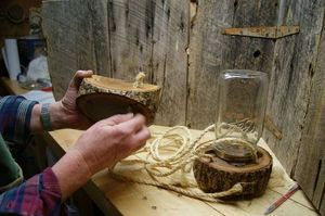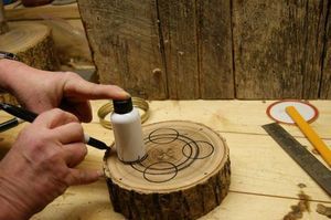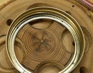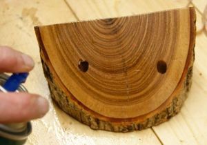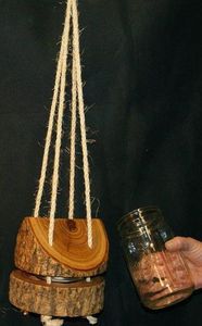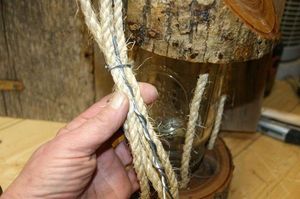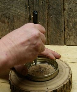 Разместите окружность в центральную часть основания. Осторожно, тщательно присоедините кольцо к бревну, вооружившись четырьмя стержнями для крепления твёрдых изделий или округлыми гвоздиками, к кольцу не следует раскачиваться из стороны в сторону. Вслед за присоединением, нужно убедиться, прочно ли он закреплен. Вставьте банку и прикрутите ее к кольцу.