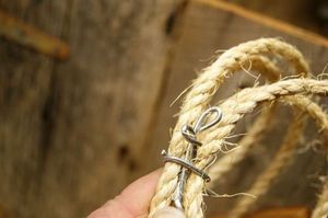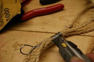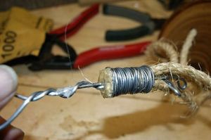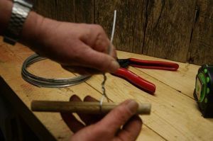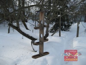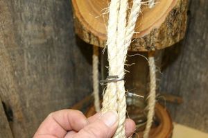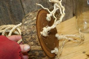 Снизу бревна всуньте веревку и закрепите с помощью обширной связки , чтобы не позволить нити возможность выйти. Вденьте и в одну, и в другую часть бревна нить. А наверху следует перемотать веревку металлической нитью. Можно оставить две крупные порции нити и повесить приспособление для птиц на них, да и можно просто воспользоваться стерженек с небольшим загибом на конце для зацепления.