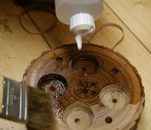 Для начала нужно покрыть наружную сторону, приготовленным неорганическим сырьем, где и расположены кружечки. Всю оставшуюся поверхность нужно обработать слоем лака.