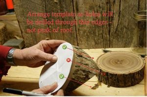 Воспользуйтесь листом и сделайте круговое движение вокруг части бревна, на котором будут сделаны дырочки, фломастером. Сделайте окружность из листа или листьев, и согните в четыре раза, а затем извлеките выделенные участки. Обязательно обратите внимание свое на то, чтобы все круги были одинаковой формы и величины. Получившийся шаблон, размеры которого должны быть приближены по величине к дереву. приложите к бревну и отметьте щели в бревне.