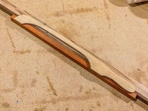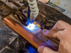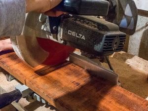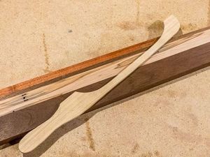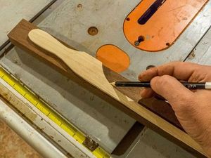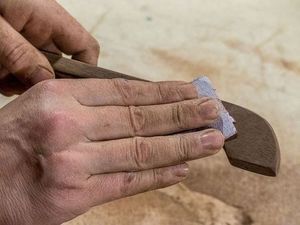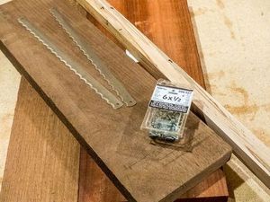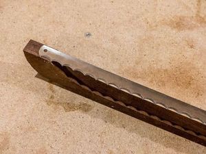 Длина ножа примерно 20 см. Лезвие расположено вдоль основания. Соответственно, рукоятка из дерева должна быть длиною в 20 см. Можно изготовить нож из одной породы дерева, но также можно взять и скомбинировать несколько пород. Если использовать только один вид древесины, то вырезать нужно один кусок, ширина которого будет равна 4 см. Для выполнения этой работы можно воспользоваться циркулярной пилой.