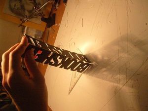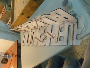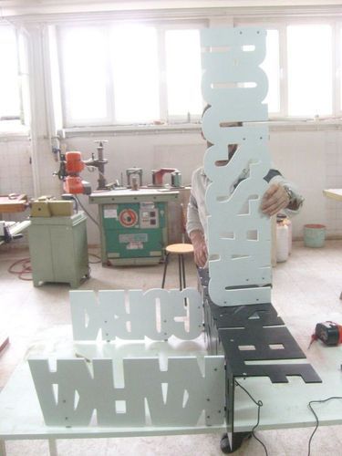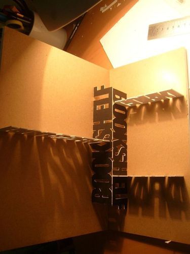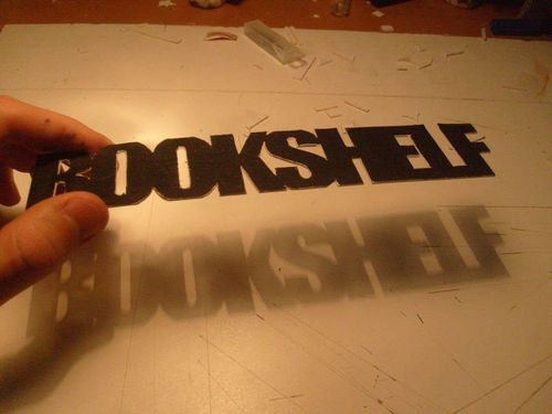Из листов в двойном экземпляре вырезается слово. В данном случае это «bookshelf» - книжная полка, но можно заменить его на любое другое. Нужно загладить края у обоих элементов, а потом закрасить темной краской фронтальную их часть. Сзади будут располагаться светодиоды и лучше, если задняя часть будет неокрашенной, светлой.