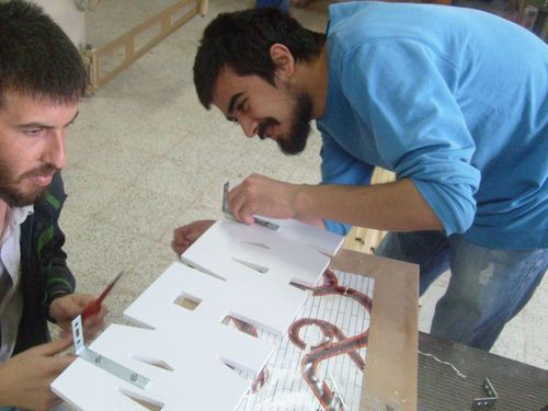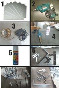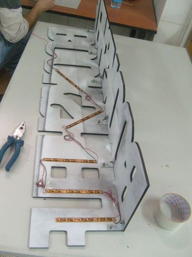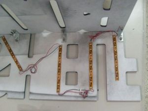 Два элемента скрепляются под углом 90 градусов с помощью крепежных материалов. Слова должны быть соединены зеркально. Сзади к буквам крепится светодиодная лента, по всей длине или отрезками, чтобы свечение было равномерным. Адаптер крепится к задней части полки (основе), чтобы оставаться незамеченным.