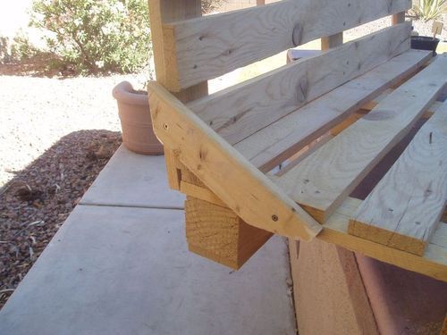 В качестве боковин выступают деревянные бруски, обрезки. Их длина зависит от того, под каким они будут крепиться углом. Лучше сделать замеры прямо на месте, приложив бруски к скамье. Две боковины гарантируют надежную поддержку и удобство.