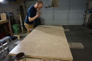 В качестве основы для панно возьмем ненужную пустотную дверь. Распиливаем ее, чтобы получилась пропорция 2:1. Именно такие пропорции имеет разлинованный лист, который мы ранее распечатали.