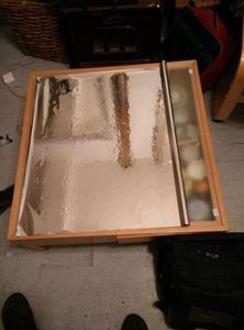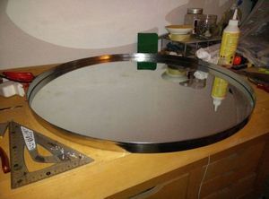 Для итоговой сборки из излишка органического стекла оргстекла подготавливаем маленькие четырехугольники-подставки, прикрепляем их на гладкую, отполированную поверхность, отражающую находящиеся перед ней предмета. Протяженность четырехугольников должна прикрывать отражающую поверхность. Таким образом, к отражающей поверхности прикрепляем приблизительно 10 подставок и монтируем на них органическое стекло с узкой полоской, в верхней части можно поместить что-то для увеличения веса, и даем клеящему веществу стать сухим.