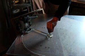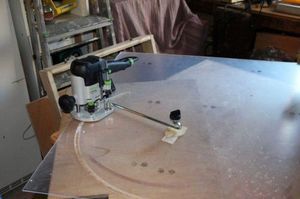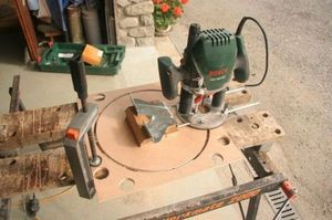 Рекомендация: в середине предстоящей окружности лучше прикрепить на клейкую с двух сторон, прозрачную ленту, на часть бревна, которое будет служить основанием для фрезера.