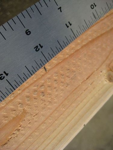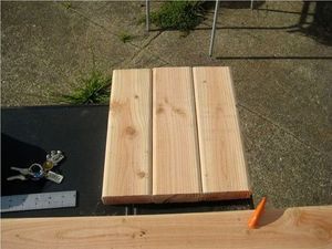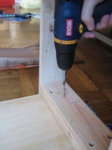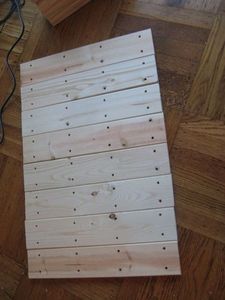 6) Сиденье для скамейки будет выполнено из фанеры. Кусок должен подходить по длине к скамейке. Чтобы крепление было надежнее, полку нужно перевернуть вниз головой и уложить на фанеру, а только потом производить манипуляции. В отмеченных точках нужно просверлить два отверстия, используя сверло 3/32 дюйма. Важно осуществлять больше давление, чтобы поверхности фанеры и досок крепко прилегать друг к другу.