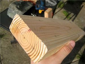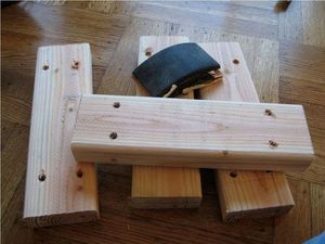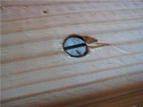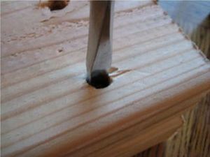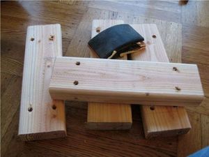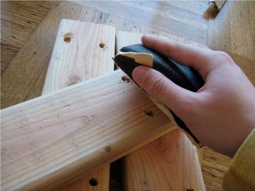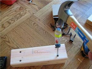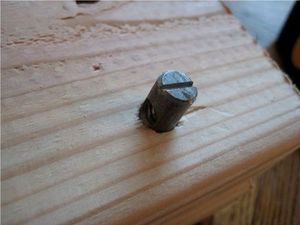 4) В четыре бруска нужно закрутить шурупы с болтами. Чтобы дюбели встали ровно, можно использовать молоток и отвертку, направляя их. На верхушку шурупа нужно поставить зубило и слегка нажать на него молотком. Нужно убедиться, что все пазы дюбелей смотрят в одном направлении внутри доски.