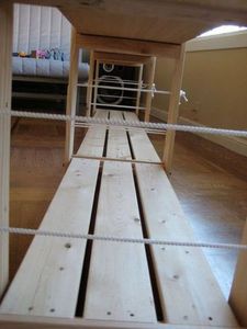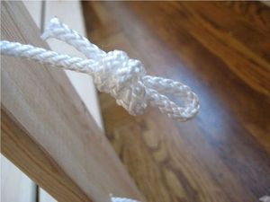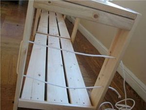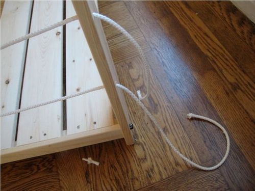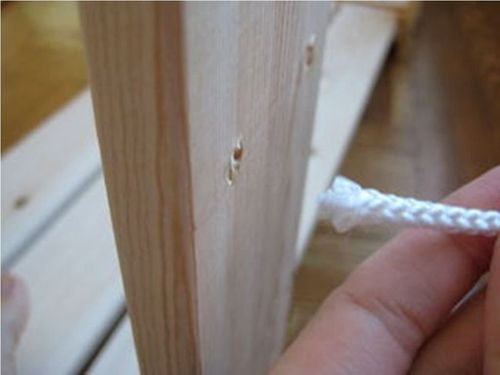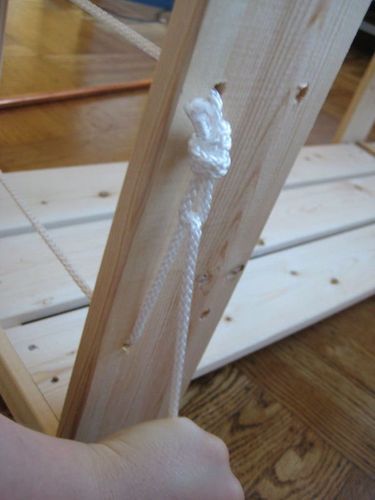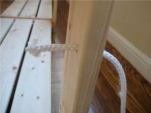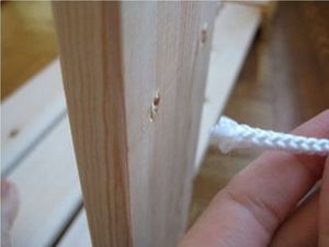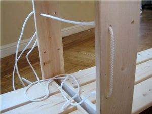 7) Через отверстия в балках продевается веревка, которая служит перегородкой. Книги (или другие предметы) будут надежно удержаны внутри полки и не провалятся в трещины посередине. Протянутые веревки должны напоминать по форме прямоугольник. Сначала веревка проходит в два боковых отверстия, начиная с верхнего, потом в два других. На концах завязываются узлы. Прямоугольник закрыт.