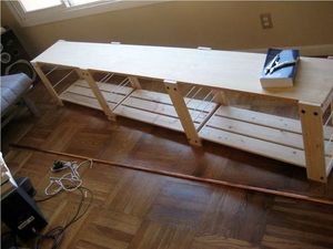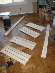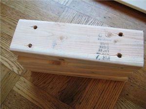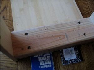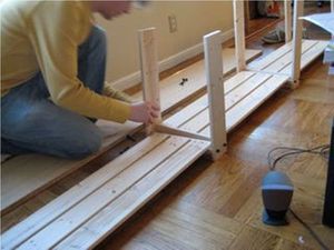 5) Пришло время собрать все бруски воедино. С помощью оборудования IKEA три уже имеющиеся полки крепятся к балкам. Крепление приходится на нижнее отверстие. По краям крепление приходится лишь на одно отверстие.
