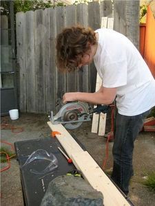 1) Стеллаж «Горм» нужно разобрать на составные части: длинные балки и полки. Балка с отверстиями нарезается на равные бруски. Работа начинается с нижнего края балки. Отмерив расстояние в 46 см, нужно отрезать доску. Потом приложить ее к балке, провести линию и снова отрезать. В конечном итоге должно получиться восемь равных досок.