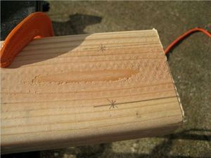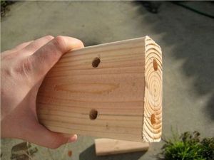 Расстояния от верхнего и бокового края с торца доски - 2 см. Отверстия пересекаются в форме буквы «Т».