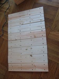 От края доски на внешней стороне нужно отмерить 5 см и высверлить сквозные отверстия с двух сторон каждой доски.